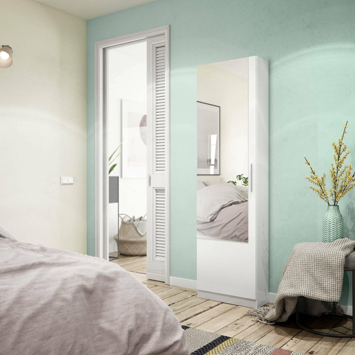 Dmora - Mobile Scarpiera Moderna con Specchio, Armadio Porta Scarpe Componibile per Ingresso, 1 Anta, 50x22x180 cm, Colore Bianco