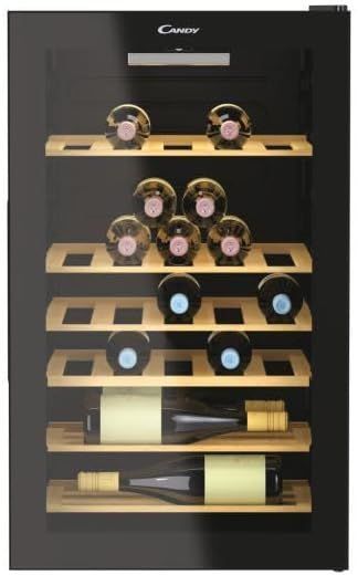 Cantinetta vino Candy CWC 150 MHF con capacità di 41 bottiglie e 6 ripiani. La struttura è di colore nero e il prodotto è ad installazione libera. Offre connettività tramite l'app hOn e utilizza un sistema di controllo meccanico. L'illuminazione interna è garantita da luci LED. Funziona con una corrente di 0.8 A, a una frequenza di 50 Hz, e una tensione di 220-240 V. Dispone di una zona a temperatura unica, senza segnale di avviso per malfunzionamenti. Il vetro della porta è trasparente e non reversibile, con cerniere posizionate a destra. I ripiani sono in legno e il consumo energetico annuo è di 143 kWh. La classe di emissione rumore è C, con un livello sonoro di 39 dBA.