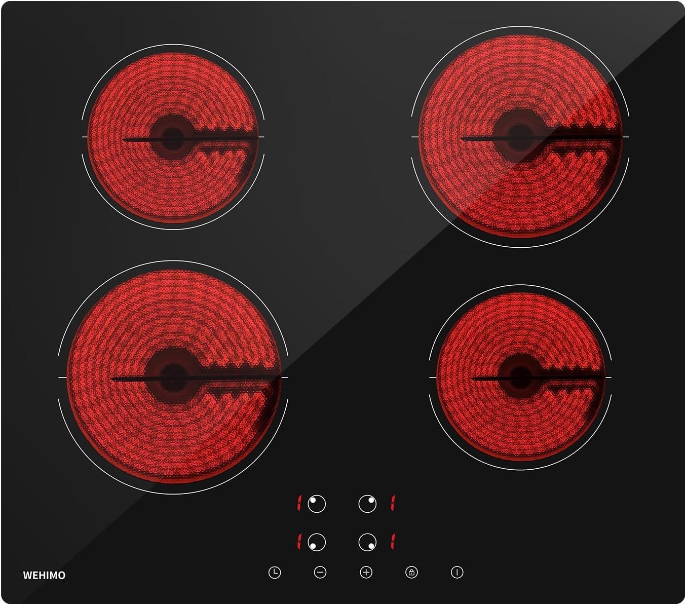 Piano cottura vetroceramica 4 fuochi, 59cm, 6000W, controllo touch e sicurezza bambini